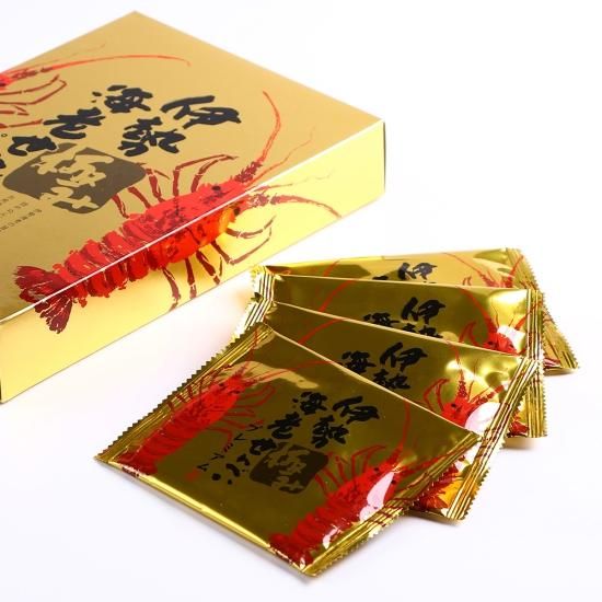 澱粉(国内製造)、えび、いか、植物油脂、食塩、砂糖、みりん、醤油、たん白加水分解物、唐辛子、伊勢えびパウダー、エビエキスパウダー(エビエキス、デキストリン)、デキストリン、エビパウダー、酵母エキス調味料(酵母エキス調味料、デキストリン、食塩)/加工デンプン、調味料(アミノ酸)、着色料(アナトー)、甘味料(ステビア)、(一部にえび・いか・小麦・大豆を含む)